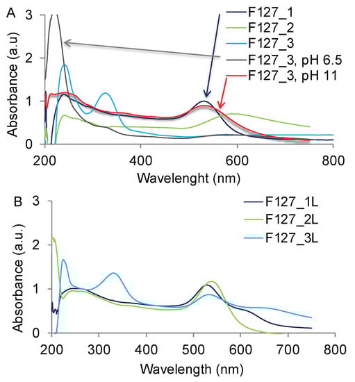 Absorbance spectra in the mixtures of 0.25 mM HAuCl4 and different F127 batches (A) before and (B) after lyophilization. The HAuCl4 concentration was 0.25 mM and F127 concentration was 6.3%. The reaction mixtures were incubated for 2 h (unless shown 1 h) at 45 °C.