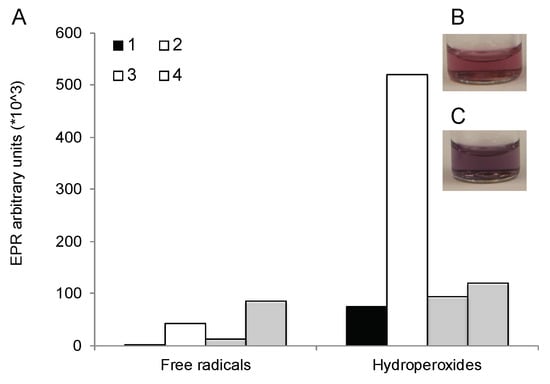 This study measured changes in the content of free radicals and hydroperoxides before and after mixing of F127 solution with HAuCl4·3H2O (Figure 9A). At 2 h the content of free radicals remained relatively small, however, there was a very considerable increase in the hydroperoxides. To elucidate the role of oxygen in the formation of the hydroperoxides in the course of the reaction we purged the copolymer solution with nitrogen for 5 min before initiating the reaction. This resulted in attenuation of formation of the hydroperoxides in the reaction mixture (Figure 9A). In this case, we did not register the UV spectra to avoid exposure of the solutions to the atmospheric oxygen. However, the visual observation of the reaction mixtures at 2 h revealed that the color of the solutions was different—pink in before purging (Figure 9B) and purple after purging (Figure 9C). This suggested that the PR has red-shifted after purging, which is indicative of the alteration of the particle size and shape.