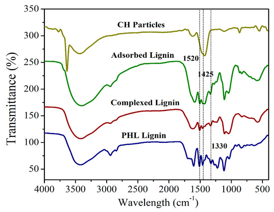 The lignin from the CH treatment process, CH solution treatment process and original PHL were analyzed by FTIR (Figure 2). The adsorbed lignin means the lignin adsorbed on undissolved CH particles after the CH treatment process, the complexed lignin means the lignin precipitates obtained by CH solution treatment, and the PHL lignin is obtained by centrifugation of the original PHL. The adsorbed lignin, complexed lignin, and PHL lignin showed classic structures [16,32], for example, 1520 cm−1 is associated to the vibration of C=C groups of the aromatic skeletal of lignin. 1425 cm−1 attributed to C–H in plane deformation with aromatic ring stretching, 1330 cm−1 attributed to C–O of the syringyl ring. The FTIR spectra of original CH particles were similar to those reported in the literature [2]. Those FTIR spectra at 1520, 1425, and 1330 cm−1 for the CH precipitation adsorbed by lignin, lignin-calcium complexes, and original PHL lignin proved the adsorption of lignin onto the undissolved CH particles.