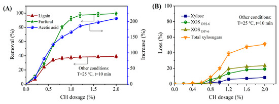 Influence of CH dosage on (A) the contaminant removal (furfural and lignin) and acetic acid increase of the original PHL and (B) the loss of xylose, XOSDP2~6, XOSDP>6, and total xylosugars.