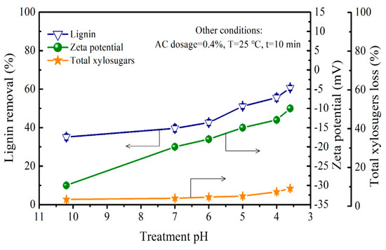 Influence of treatment pH on the lignin removal, total xylosugars loss, and zeta potential of AC.