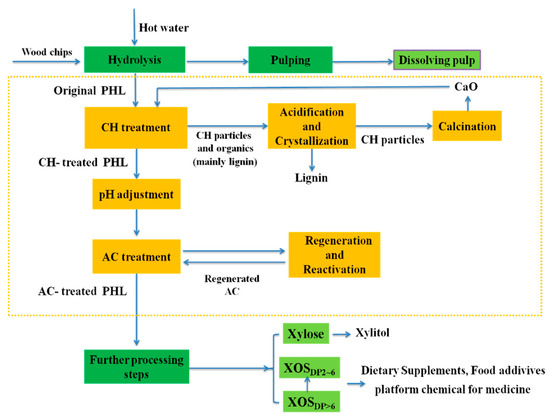 A proposed process diagram for purifying or separating xylose and XOS of PHL from the kraft-based dissolving pulp production process is shown in Figure 6. In this proposed process, CH treatment can effectively remove furfural and lignin with higher molecular weight at a negligible xylosugars loss, and AC treatment can successfully remove the residual lignin with lower molecular weight and result in a slightly loss of xylosugars. In CH treating process, CH particles remove lignin via the precipitation (lignin-calcium complexes) and adsorption; as a byproduct, the removed lignin can be further recycled and purified through acidification and crystallization for purification and improvement [31]. The used CH particles can be recycled and transformed into CaO via calcination in the lime kiln, and CaO can be further reused for the CH treatment process. The pH can be optimized for the CH-treated PHL before AC adsorption due to its significant influence on lignin adsorption efficiency onto AC surfaces. For the AC treatment, the contaminants can be further removed via adding AC at different dosage into CH-treated PHL at the optimal pH with small total xylosugars loss, and the used-AC can be regenerated via burn/thermalization and reactivated via acidification to promote the reuse and recycle of AC in the AC adsorption process [22]. Besides, the residual lignin with lower molecular weight in PHL after CH and AC treatment can be further removed via other methods, such as the laccase-induced lignin polymerization process, lignin peroxidase-induced polymerization process, and flocculation. The concentrations of xylose and XOS in PHL after purification can be increased by subsequent acid/enzymatic hydrolysis [37,38]. For the proposed process, the removal of contaminants (lignin, furfural) and the purification of hemicellulose in PHL can enhance the hemicellulose hydrolyzates obtained from the proposed process to prepare the value-added products (e.g., XOSDP2~6, bioethanol, xylitol, additives, dietary supplements, and chemicals) in the subsequent biorefinery process [2,7,17,39,40,41,42].