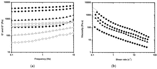 | Microparticles | G’ (Pa) | G” (Pa) | G* (Pa) | tan δ (=G”/G’) in 1 Hz | n ƞ = K·γn−1 |