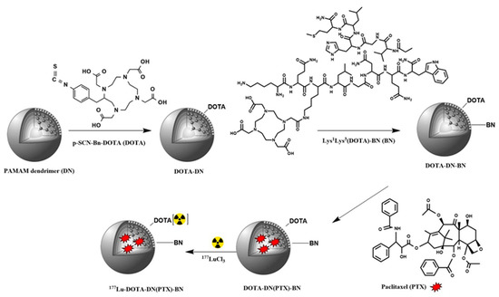 The efficacy of PRRT could be improved by using a polymeric radio—and drug—therapy nanosystem for a concomitant therapeutic effect on malignant cells. In this context, the aim of this research was to prepare and evaluate a novel drug and radiation delivery nanosystem based on the 177Lu-labeled PAMAM dendrimer (DN) loaded with PTX and functionalized on the surface with the Lys1Lys3(DOTA)-bombesin (BN) peptide for specific targeting to gastrin-releasing peptide receptors (GRPr) overexpressed on breast cancer cells.