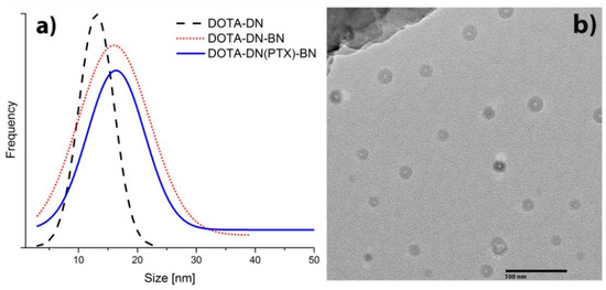 (a) Size distribution of the different nanosystems (b) TEM of DOTA-DN(PTX)-BN.