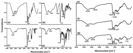 The FT-IR spectrum of (a) PAMAM Dendrimer (DN), (b) pSCN-Bn-DOTA (DOTA), (c) Lys1Lys3(DOTA)-BN (BN), (d) Paclitaxel (PTX), (e) DOTA-DN, (f) DOTA-DN-BN, (g) DOTA-DN(PTX)-BN.