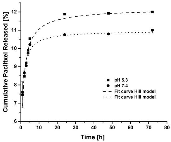 The release profile of PTX was prolonged. The PTX desorption was dependent on pH and resulted to be higher under acidic conditions than under neutral conditions (Figure 4, Hill Model) through disturbance and disruption of hydrogen bonding. Hence, the observed release rate of DOTA-DN(PTX)-BN at pH 5.3 is favorable for cancer therapy. Additionally, it would be expected that acidic intra-cellular conditions (intracellular lysosomal environment) improve the PTX release with the consequent increase of local drug concentration.