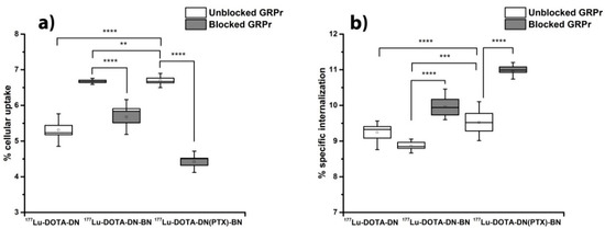 In order to demonstrate the specific uptake of nanoradiopharmaceuticals via Bombesin-GRPr recognition, uptake and internalization assays in T47D cells (GRPr-positive) were carried out (Figure 5). The ANOVA (1 way) for multiple comparisons showed a statistical significant difference between 177Lu-DOTA-DN(PTX)-BN and 177Lu-DOTA-DN (p < 0.05) (cell uptake of 6.67% vs 5.31%, respectively), which confirmed the active uptake mechanism through the interaction Bombesin-GRPr. There was no significant difference between nanosystems containing the molecular recognition molecule (177Lu-DOTA-DN-BN, 6.67% and 177Lu-DOTA-DN(PTX)-BN, 6.70%).