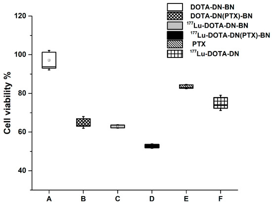 As expected, there was no statistical significance between the cell uptake of DOTA-DN(PTX)-BN when compared with 177Lu-DOTA-DN-BN (p > 0.05). This therefore implies that the produced cytotoxic effect caused by 177Lu and PTX was at the same level.