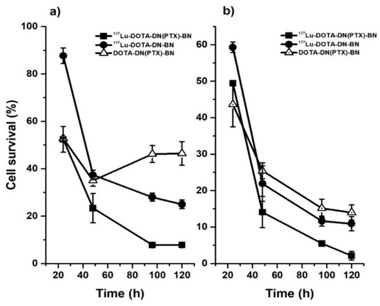 Nanosystems containing and delivering both, chemo—and radiotherapy are more effective than nanoparticles containing only PTX. When T47D breast cells were treated with the targeted nanosystem providing only PTX (DOTA-DN-(PTX)-BN) at 13.40 µM, the cell viability increased after 48 h (Figure 7a). This behavior was attributed to the DNA repair rate. The concentration of delivered PTX was unsuccessful in producing disrupting of microtubules. After 120 h of treatment with DOTA-DN-(PTX)-BN, the cell viability was 14.00 ± 2.06%. The viability of cells treated with 177Lu-DOTA-DN-BN was 10.93 ± 1.17%, and the treatment of cells with 177Lu-DOTA-DN-(PTX)-BN resulted in the lowest viability of 1.32 ± 0.71%. These results demonstrated that the combination of PTX and Lu-177 in the same nanoprobe was more effective than PTX or Lu-177 alone.