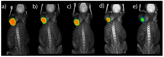 Subcutaneous tumoral model. Intratumoral administration of 177Lu-DOTA-DN(PTX)-BN after (a) 1.5 h, (b) 9 h, (c) 10 h, (d) 24 h, (e) 120 h.