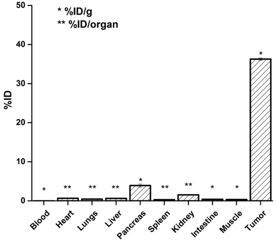 Nano-radiopharmaceuticals have to be injected intratumorally or peritumorally due to the nanoparticles nature since they accumulate significantly in the reticuloendothelial system when the intravenous administration is used. The biodistribution of 177Lu-DOTA-DN(PTX)-BN after 120 h (Figure 9) demonstrated that 36.25% of the radioactivity remained into the tumor, with only a 3.93% in the pancreas and 1.53% in kidney, which are organs widely reported to express GRPr [30].