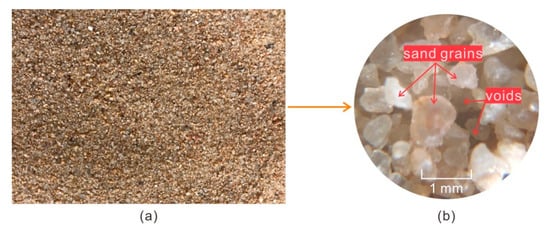 The sand used in this study is derived from the Nanjing area in Eastern China. The sand taken back from the site was air-dried first, and then sifted with 2 mm sieve. The prepared sand was pictured in Figure 1, and the physical parameters were measured according to the laboratory soil tests displayed in Table 1. As shown, the irregular block sand grains were dis-attached, and the sand showed less clay content and a loose structure. The main component of the sand was the grains in the range of 0.1 to 0.5 mm. The uniformity (Cu) and curvature coefficient (Cc) were calculated as 2.27 and 1.13, respectively. Thus, the sand was defined as poorly graded (SP), according to the Unified Soil Classification System (USCS) (American Society of Testing Materials D2487-11, West Conshohocken, PA, USA).