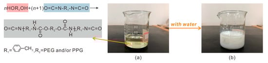 The organic polymer (OP) selected to stabilize sand contains plenty of polyurethane pre-polymer. The polymer used in this study is prepared according to a fixed procedure, and the reaction formula is given in Figure 2.