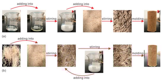 For the OPSS, the fabrication process was displayed in Figure 4a. The necessary sand, polymer, and water were prepared with the required quantity first, and then the obtained water was added into the polymer and stirred with a glass rod for about 20–40 seconds to achieve a milky solution. After that, the prepared polymer solution was added into the sand and mixed with a coulter knife for 1–2 min to obtain a uniform polymer-sand mixture. Next, the mixture was transferred into the steel mold and compacted to the pre-determined height by applying static pressure. By comparison, the difference in OPCFRS or OPSFRS preparation was that fibers were added prior to the addition of the polymer solution and mixed manually with wet sand in a small increment to ensure uniform distribution. The fabrication process for the polymer and fiber-treated sand was displayed in Figure 4b.