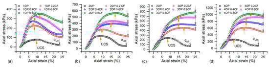 As introduced above, there are two different axial stress-strain curves forms of the treated sand. For the first one with the clear peak value, the peak stress is defined as UCS, and for the latter without a peak value, the axial stress corresponding to the strain of 15% is used as UCS for further study, as shown in Figure 6 and Figure 7.