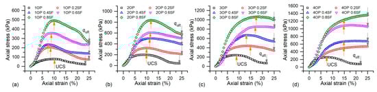 Energy absorption, a useful evaluated parameter for soil reinforcement, indicates the amount of energy required to induce certain deformation of treated sand [5], and the energy absorption is calculated from the area under the stress-strain cover up to the selected strain value [5,29]. In this study, energy absorption was determined to the axial strain of 10% (E10) and 20% (E20), according to following Equation (3). It should be noted that the calculated values of E10 and E20 are provisional because of the measurement error, and the error is controlled within required range.