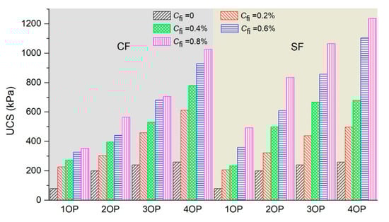 The UCS of OPSS, OPCFRS, and OPSFRS were summarized in Table 3 and Figure 8. As displayed, the UCS of treated sand increased with an increment in polymer content. It was expected that an increase in polymer content would enhance the membrane effect by increasing the coating soil area and bonding strength. Moreover, the UCS of treated sand always increased when the polymer content increased regardless of how much fiber was added, and the UCS increment induced by the polymer content grew with the addition of fiber and fiber content. The variation of the polymer content from 1% to 4% led to an increment in UCS with 179 kPa for pure polymer reinforcement and 673.82 kPa for polymer and coir fiber cooperation treatment (Table 3) respectively, which also proved to have a great treatment benefit induced by cooperation reinforcement. The polymer and fiber treatment led to more improvement in UCS, which can be explained by an addition to the polymer membrane enwrapping and bonding soil grain, and the interfacial force between the sand grain and fiber. The bond built by the membrane between sand grains and fibers also contributed to the improvement of the cooperation treatment effectiveness. Figure 8 also showed that the fiber content increase led to an enhancement in compressive strength, and the treated sand with coir fiber yielded up to about 1 MPa compressive strength, with 1.2 MPa for sisal fiber cooperation treatment (Table 3). Moreover, the sisal fiber illustrated a better effect for the improvement of compressive strength than the coir fiber. For example, the 0.8% coir fiber addition resulted in the UCS of 4% polymer reinforced sand increasing by four times, while the treated sand with sisal fiber increased by 4.8 times. Except for the excellent elastic modulus of sisal fiber, the residual substance on the surface of sisal fiber may also strengthen the interaction force between the sand grain and fiber, and it was, therefore, the sisal fiber cooperation treatment that demonstrated better reinforcement.