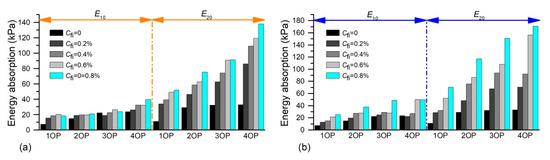 The calculated E10 and E20 according to Equation (3) were given in Table 3 (shown in the beginning of the Results and Discussion part), and the relationship between absorbed energy and polymer and fiber content was given in Figure 9. It was observed that E10 and E20 both increase when the polymer content increases. The E10 of treated sand with different polymer content (i.e., 1–4%) was observed as 7.33, 15.06, 22.39, and 23.63 kPa, respectively (Table 3). The difference of E10 induced by the polymer amount implied that the presence of the polymer has worked before the axial strain reached up to 10%, and the higher polymer content treatment needed more energy to induce an equivalent deformation. Figure 9 also showed that the E10 and E20 value both increased with the fiber content increasing. Nevertheless, the fiber content played a more vital role on E20 than that on E10. For example, 0.8% sisal fiber addition led to E10 and E20 of 4% polymer-treated sand increasing by 26 and 173.65 kPa, respectively (Table 3). It was expected that the fiber addition improved the bearing capability of treated sand and, therefore, the fiber effect was not fully apparent before the axial strain increased up to 10%. However, the specimen may have failed before 20% deformation, and the fiber effect had been fully exerted, which results in apparent difference in absorbed energy. Moreover, the sisal fiber had greater advantages than coir fiber on improving energy absorption. It needed a 39.71 and 137.90 kPa induction of 10% and 20% deformation for OPCFRS, while it was 49.63 and 170.52 kPa for OPSFRS (Table 3). This may be attributed to the excellent elastic modulus of sisal fiber.