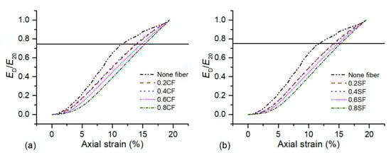 Absorbed energy for different axial strains (ED) is normalized to the energy absorbed in the 20% axial strain for different fibers content [5,30], which is used to further investigate energy absorption. The normalized absorption energy curve of 1% OP-treated sand with coir and sisal fiber was shown in Figure 10. As observed, the slope of the energy absorption ratio curve for OPSS changed, and an apparent change in the slope can be observed at about 75% energy absorption and 11% axial strain. The literature found that a breakdown in the rate of the normalized energy absorption curve for fiber-reinforced cemented sand was observed at an energy absorption of 50% [5] and 30% [30]. This difference may be induced by the elasticity and flexibility behaviors of reinforcement materials. However, the inclusion of fibers and an increment in fiber content both led the slope of the curves to flatten, and it meant that the energy absorption capacity of the treated sand increased at a constant rate. When the fibers content increased from 0% to 0.8%, the associated axial strain increased to about 15% regardless of the fiber types. Furthermore, the slope of the energy absorption ratio curve was proactively unchanged by the fiber types.