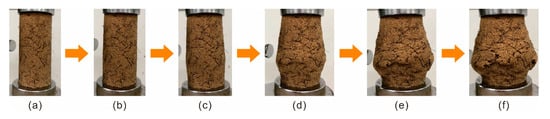 The photographs of treated sand during the UCS test process in (a) ε = 0%, (b) ε = 5%, (c) ε = 10%, (d) ε = 17%, (e) ε = 23%, and (f) ultimate.