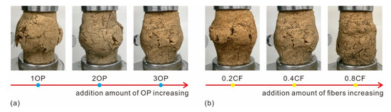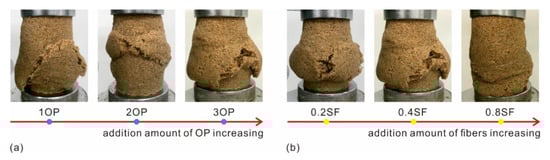The failure patterns of OPCFRS and OPSFRS using different polymer and fiber contents were shown in Figure 13 and Figure 14. As expected, the specimens all destroyed the middle section. As shown in Figure 13a and Figure 14a, the treated specimens with 1% OP were divided into several segments by macro cracks and these cracks may connect somehow inside the specimen. Moreover, the failure forms got better with polymer content increasing. The macro cracks that formed along the surface of the specimen became narrow and short (Figure 13a and Figure 14a), and reduced the connection possibility among these cracks, and, therefore, improved the completeness of treated sand. Figure 13b and Figure 14b also showed that an increment in fibers content resulted in significant improvement in soil ductile behaviors visually. For the treated sand with little fiber addition, there were still macro cracks on the surface of the specimen. Nevertheless, with fiber content increasing, the visible cracks on the surface of the specimen became micro-cracks. The failure form of treated sand with higher fiber content bulged and twisted (Figure 13b with 0.8CF and Figure 14b with 0.8SF). Since the distribution density increasing induced by fiber content was more effectively disturbing the sand grains displacement to the free side or space [32], the sand grains consumed the external energy by moving or flipping within the limited space inside of the specimen, with ineffective displacement [27].