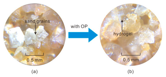 The XRD results of sand and treated sand were displayed in Figure 15. As observed, there were no new materials in treated sand, which generated because of the addition of the polymer. Generally, there was no chemical reaction between polyurethane (i.e., the products of water and polymer) and sand grains. The hydrogel, formed by the polymer and water, absorbed on the surface of sand grains via hydrogen and inter-molecular force, and the hydrogel gradually turned to a thin and hardened polymer membrane with the evaporation of water, which resulted in an improvement in elasticity, flexibility, and strength [27,28,33]. The micro photographs of sand and polymer-treated sand were given in Figure 16. As shown, the unreinforced sand with a loose structure and small adhesive force was not prepared as the standard cylindrical specimen. The polymer addition effectively improved this issue. The polymer hydrogel enwrapped the sand grains and connected the dis-attachment sand grains, which led to an increment in adhesion among soil grains and a reduction in soil voids, like that shown in Figure 16b, and it, therefore, enhanced the stability of the micro-structure inside the specimen.