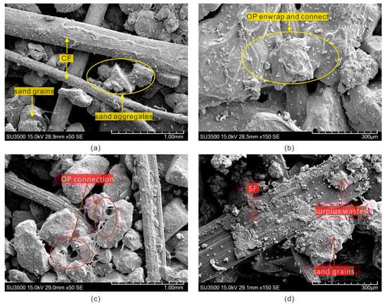 The micro structure of treated sand was studied by scanning electron microscopy (SEM, SU3500, Hitachi, Tokyo, Japan), and the SEM photographs of OPCFRS and OPSFRS were shown in Figure 17. Due to the presence of the polymer, the dis-attachment sand grains easily formed sand aggregates (Figure 17a). It also showed that the distributed natural fibers crossed and interlinked to build a three-dimensional structure among sand aggregates to restrain the displacement of sand grains (Figure 17a,c). With the high hydrophilic properties of natural fibers, the polymer hydrogel was easily attached on the fibers’ surface to provide a good bond between the fiber and sand grain (Figure 17b,c), which resulted in an improvement of the micro structure in a sand-fibers matrix. However, the residual material on the fiber surface would influence the interactions between the fiber and the polymer membrane, which leads to a reduction in bond strength. However, at the same time, the residue would increase the friction strength between the fiber and sand grain somehow. Additionally, the surplus residue on the surface of sisal fiber was more clear than that on the coir fiber (Figure 17b,d). Moreover, when the polymer solution mixed with the sand-fiber matrix, the polymer solution would flow into the cracks and cell lumens on the rough coir fiber surface and then consolidated to form a bond. Therefore, the contributions to the improvement of the micro structure of treated sand can be concluded as [28,33]: (i) the polymer membrane coating and bonding sand grains, (ii) the interfacial physical force between the sand grain and fiber, and (iii) the bonding conferred by the membrane between the fiber and soil grain. Furthermore, the polymer content and fiber content increasing both improved these introduced aspects.