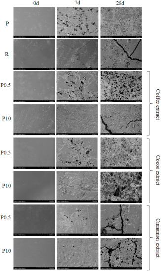 After 28 days of composting, further changes in the surface structure of the tested materials were observed. The most degraded surface has been observed for samples on which the number of microorganisms after seven days of composting was large. Composting caused the largest changes for P samples and samples containing coffee and cocoa extracts. The changes for the remaining samples were smaller, but the impact of composting time on the surface biodegradation process was clearly visible.