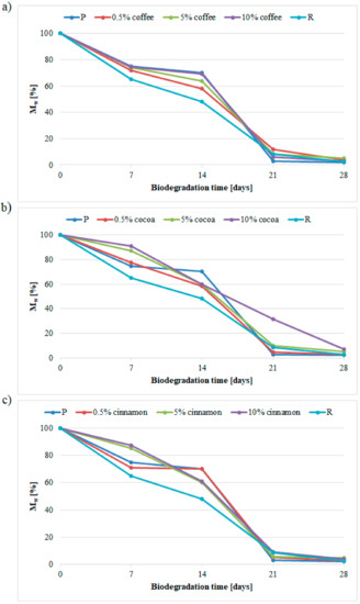 The effects of composting for 28 days largely depended on the type of material. Samples P, R and samples containing 0.5 wt % of coffee or cinnamon extracts have almost completely disintegrated. Among materials containing 0.5 wt % of the tested extracts, only the sample containing the cocoa extract remained in initial form, however its color became even less intense. The resistance of materials to biodegradation increased with the increase of extract content. All samples containing 10 wt % of extracts after 28 days of composting were still in one piece, however, they were very fragile. Further changes in appearance were also observed.