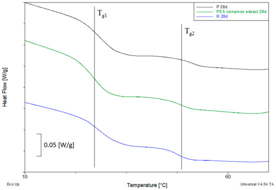 The main change related to the increase in composting time is the reduction of Tg1 of the tested materials. The Tg1 value of sample P after 28 days of composting was 6.9 °C lower than the initial value. An even greater decrease was observed for sample R, where after 21 days of composting the Tg1 value was 10.5 °C lower. Similar decreases were observed for samples containing coffee and cinnamon extracts, where the changes ranged from 2.9 to 12.4 °C. A much more stable Tg1 was obtained for samples containing cocoa extract. Throughout the composting intervals, the values of individual samples were very similar, and the differences in most cases did not exceed 2 °C.