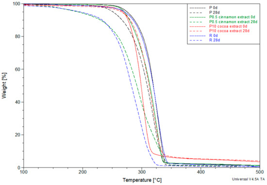 Analyzing the results, it can be seen that only the cocoa extract adversely affected the reduction of thermal resistance caused by the effects of composting process. Despite the observed decrease in molecular weight, the T5% values obtained in individual composting periods were mostly higher than those obtained for the pure PLA. Other extracts and the reference anti-aging compound did not inhibit the processes leading to a decrease in thermal resistance. Particularly large changes compared to other extracts were observed in the case of cinnamon extract. Despite the molecular weight values similar to the other samples, the T5% of the samples containing cinnamon extract were significantly lower than the others.