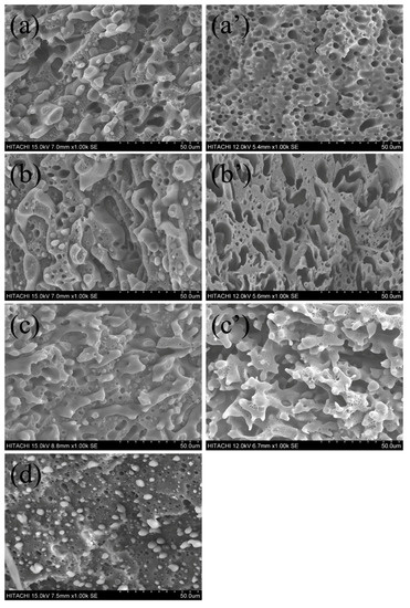 Scanning electron microscope (SEM) of poly (lactic acid) (PLA)/high-density polyethylene (HDPE) (w/w) blends, (a,a′) 50/50, (b,b′) 60/40, (c,c′) 70/30, and (d) 80/20.
