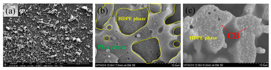 The micro morphology of PLA/HDPE blends and PLA/HDPE/CB composites was imaged by a scanning electronic microscope (SEM, HITACHI SE3400N, Tokyo, Japan) at 10–15 kV accelerating voltage. In order to clearly distinguish the micro phase structure, the PLA phase was etched by chloroform for 2 h at room temperature.