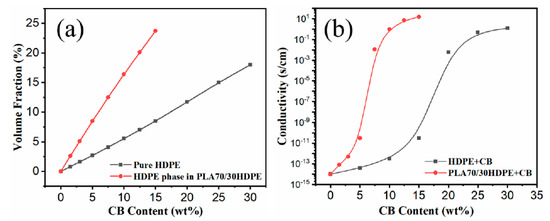 In order to illustrate the excellent electrical conductivity of PLA/HDPE/CB composites owing to the co-continuous structure and selectively located CB, the CB-filled HDPE with different CB loadings was prepared via the same processing conditions as a comparison. Figure 4a shows the volume fraction of CB in the HDPE phase of PLA70/30HDPE composites and HDPE with the same CB loadings. According to the following formula (Equation (6)):