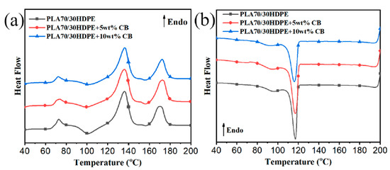 (a) Melting and (b) cooling curves of PLA70/30HDPE/CB with different CB loadings.