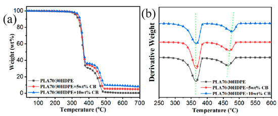 (a) TGA and (b) DTG curves of PLA70/30HDPE/CB with different CB loadings.