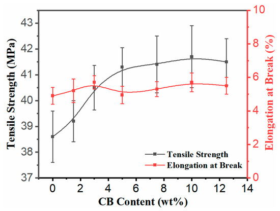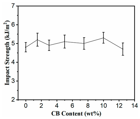 It is very important for the functional composite to have a certain mechanical strength for a wide range of applications. The tensile strength, elongation at break, and impact strength of PLA70/30HDPE/CB composites with different CB loadings are shown in Figure 7 and Figure 8. As presented, the tensile strength of PLA70/30HDPE/xCB composites (x = 0, 1.5, 3, 5, 7.5, 10, 12.5) is increased from 38.6 MPa to 41.7 MPa with the increased CB loading. The similar tendency can be observed in other CB filled incompatible blends. It can be thought that the increase in the tensile strength is the result of the introduction of the higher modulus CB and the change of morphology between PLA and HDPE. In addition, compared with HDPE, PLA is a brittle polymer. Theoretically, the tensile toughness of PLA70/30HDPE blend is mainly determined by the PLA component and exhibits brittle tensile fracture with lower elongation at break. As shown in Figure 7, the elongation at break of the PLA70/30HDPE blend is just as low as 4.9%, which is very close to the elongation at break of pure PLA and much lower than that of pure HDPE. With the introduction of CB, and as CB is selectively distributed in the HDPE component, there is no change for the elongation at break of PLA70/30HDPE/CB composites with different CB loadings, and the elongation at break of PLA70/30HDPE/CB composites maintained at around 5% with the increasing content of CB. The reason is probably because CB is selectively dispersed in the tough HDPE phase, and the tensile toughness of the composite is still determined by the brittle PLA component. In the same way, with the increase of CB content, the impact strength of the composite is also maintained at about 5 kJ/m2, and there is no obvious change, as shown in Figure 8. Even so, the introduction of CB does not deteriorate the mechanical properties of the PLA/HDPE blend, but slightly increases the tensile strength of the PLA70/30HDPE/CB composite, and the mechanical properties of the PLA70/30HDPE/CB composite enable it to meet most application needs.