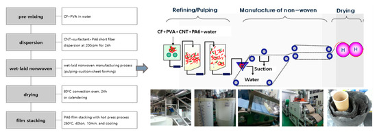 Carbon fiber (T700; 12K, 800TEX) was purchased from Toray (Tokyo, Japan) and cut into 10-mm-long pieces using a Fidocut machine (Schmidt & Heinzmann, Bruchsal, Germany). CNTs (Hanwha Chemical Co., Ltd., Seoul, Korea) were used multi-wall carbon nanotubes with a purity of 97%, 10–15 nm in diameter, and 180–200 μm in length. Kolliphor P188 as a surfactant was purchased from Sigma-Aldrich (St. Louis, MO, USA). Polyvinyl alcohol (PVA) from Kurary (Tokyo, Japan) was prepared as a binder. Polyamide 6 (PA6) fiber, 0.4 mm in length of 0.4 denier, and films, 58 g/m2 in weight and 0.06 mm in thickness, were obtained from Sam Young Chemical (Seoul, Korea). All reagents were used as received.