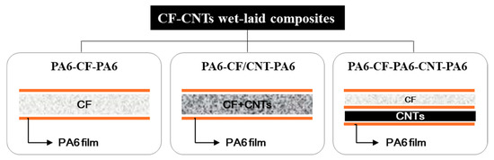 Figure 2 presents a schematic diagram of the CNT–CF-nonwoven samples. The structure of the CNT–CF-nonwoven composites was examined using two methods. One was making a single layer of nonwoven fabric by mixing carbon fibers and CNTs, simultaneously. The other was making each layer of nonwoven fabric by carbon fibers and CNTs, separately, and integrating them with a PA6 film. For this preliminary experiment, CF (2 g) and CNT (1 g) were dispersed in water, and then prepared in separate layers or in a mixed layer. The prepared CF and CNT web was completed as a composite using a PA6 film stacking process.