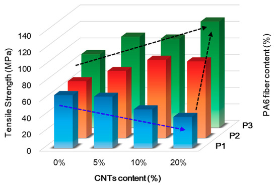 The tensile strength of the CNT–CF-nonwoven composite increased with increasing PA6 short fiber content. For the samples without CNTs, the tensile strengths were 64.24, 68.60, and 89.03 MPa for P1-C0, P2-C0, and P3-C0, respectively. This tendency was the same until up to 20 wt % of CNTs (37.84, 92.63, and 128.59 MPa for P1-C20, P2-C20, and P3-C20, respectively) because the PA6 short fiber reduced the empty space and facilitated load transfer in the composites. In addition, the mechanical properties of the carbon fiber-reinforced composites are closely related to the interfacial bonding between the carbon fiber surface and polymer matrix, which is relatively low because of the non-polar surface of the carbon fibers [13,26]. Carbon fibers have some chemical groups, such as carboxyl, epoxy, ether, and hydroxyl groups, which easily form chemical bonds with the amide group of the matrix PA6 [6]. Therefore, as the contents of PA6 increased, the chemical bonding between the carbon fiber and PA6 matrix became stronger due to the increased number of functional groups capable of chemical bonding with the carbon fiber, resulting in an increase in tensile strength.