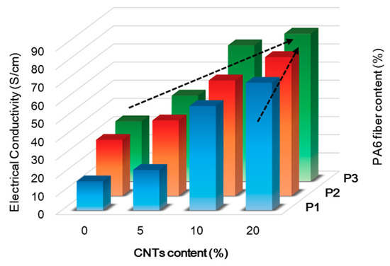 The electrical conductivity of the CNT–CF-nonwoven composites containing both CNT and PA6 short fibers increased with increasing CNT and PA6 content. The maximum value was achieved by 81.25 S/cm at P3-C20. The conductive network depended mainly on the connection conductivity among the carbon fiber, CNTs, and PA6 polymer matrix [21]. The homogeneous dispersion of CNTs between the carbon fibers with the polymer matrix leads to extensive overlap between the CNTs that establish three-dimensional conductive paths [20]. This mechanism was enhanced further as the content of CNTs and PA6 fiber increased. As a result, the electrical performance of the CNT–CF-nonwoven increased significantly with increasing CNT and PA6 short fiber content.