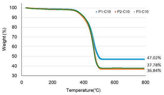 The thermal properties of the CNT–CF-nonwoven composites were examined by TGA to determine the effect of the PA6 contents on the thermal degradation of the composites, as shown in Figure 7. The samples, P1-C10, P2-C10, and P3-C10 exhibited similar thermal behavior. The weight loss in the initial process (~100 °C) was attributed to the removal of adsorbed water and decomposition of some oxygen-containing functional groups [24]. The weight losses in this temperature were 0.68%, 0.87%, and 1.02% for P1-10, P2-10, and P3-10, respectively. The curves show that thermal degradation began to occur only after the materials absorbed a certain amount of heat. The heat initiates the degradation process and breaks down the matrix structure of the material by cutting its molecular chain rupture or scission [13].
