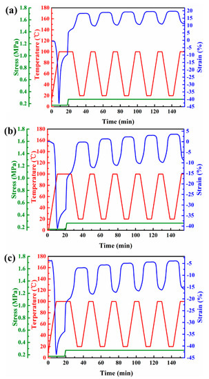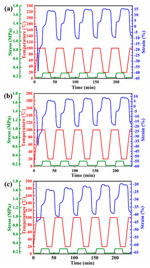 - Yang, Q.; Li, G. Investigation into stress recovery behavior of shape memory polyurethane fiber. J. Polym. Sci. Part B 2014, 52, 1429–1440. [Google Scholar] [CrossRef]