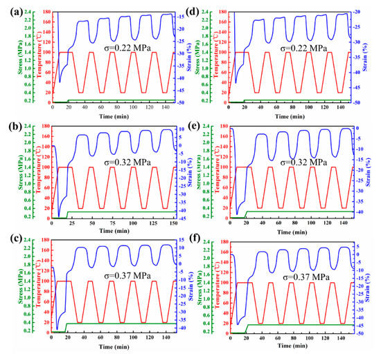 3.6. Macroscopic Thermo-Actuated 2W-SME of EVA Fiber under Constant Stress
