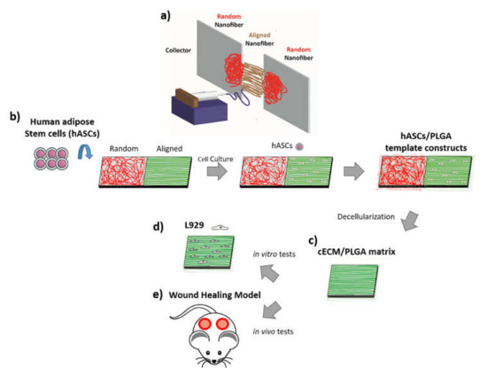 (a) Illustration of electrospinning system for PLGA nanofibrous tempate. (b) Human ASCs were seeded on the PLGA nanofibrous matrixes with either an aligned or a random structure. (c) The hASCs/PLGA nanofibrous meshes were decellularized to prepare cECM/PLGA matrixes. (d) Mouse L929 fibroblasts were seeded on the eECM/PLGA matrixes for in vitro study. (e) A surgical created full-thickness skin excision mouse was used as an in vivo model.