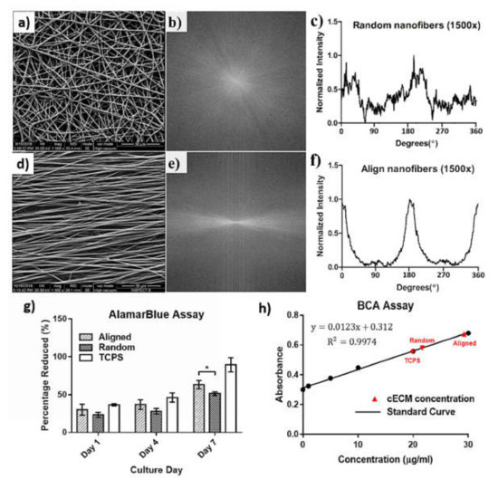 Characterizations of electrospun PLGA nanofiber. The PLGA nanofiber matrix with (a) a random or (d) an aligned structure was observed unser SEM. (b,e) SEM images of nanofibers were converted to an integer power of 2 pixel dimensions and greyscale for 2D FFT analysis. (c) No regularity of fiber alignment in random mesh samples. (f) Two peaks at 180° and 360° were found on the plot of the aligned nanofibers. The hASCs on the aligned PLGA nanofibrous meshes had (g) a significantly higher viability (p < 0.05) and (h) a higher amount of ECM content relative to that of the random ones at day 7.