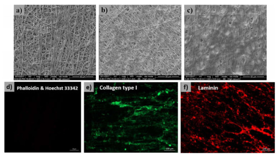 To verify the decellularization procedure, phalloidin staining against cytoskeleton F-actin and Hoechst 33342 staining against cell nucleus were conducted. No cytoskeleton or cell nucleus was found (Figure 3d), which revealed that the decellularization was complete. On the other hand, IFC staining showed a large quantity of collagen type I (green fluorescence, Figure 3e) and laminin (red fluorescence, Figure 3f) was preserved in the cECM/PLGA nanofibers, which was consistent with the findings of the SEM inspection.