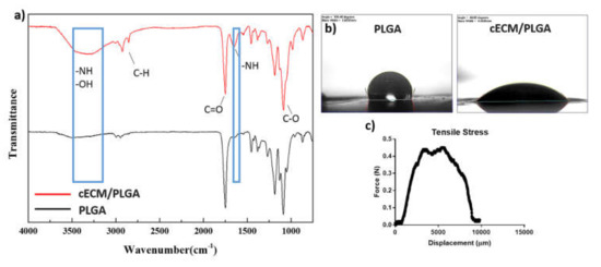 (a) FT-IR spectrum showed the presences of −NH and −OH groups (3300 cm−1), and another peat at 1600 cm−1 also represented –NH group. (b) The test of water contact angle showed a hydrophilic surface on the cECM/PLGA substrates. (c) The tensile stress test showed that the cECM/PLGA mesh had the highest stress tolerance around 0.5 N.