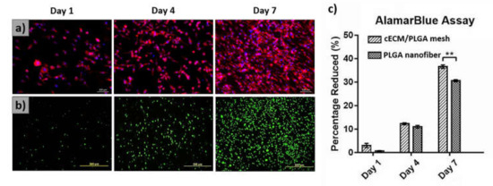 The L929 fibroblasts proliferated well on the cECM/PLGA matrixes with (a,b) good cell survival. (c) The cells on the cECM/PLGA meshes also had a relatively higher cell viability (p < 0.01) than those of one PLGA nanofibers at day 7.